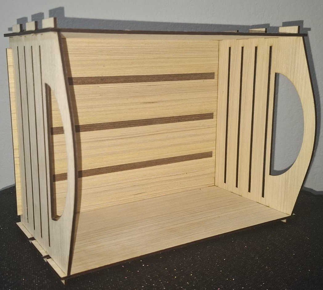La cagette est fabriquée en contreplaqué (essence variable en fonction du stock, généralement tilleul, bambou ou équivalent).