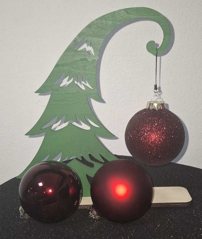 Sapin couché en bois avec boule de Noël au choix (brillante, mate ou pailletée).